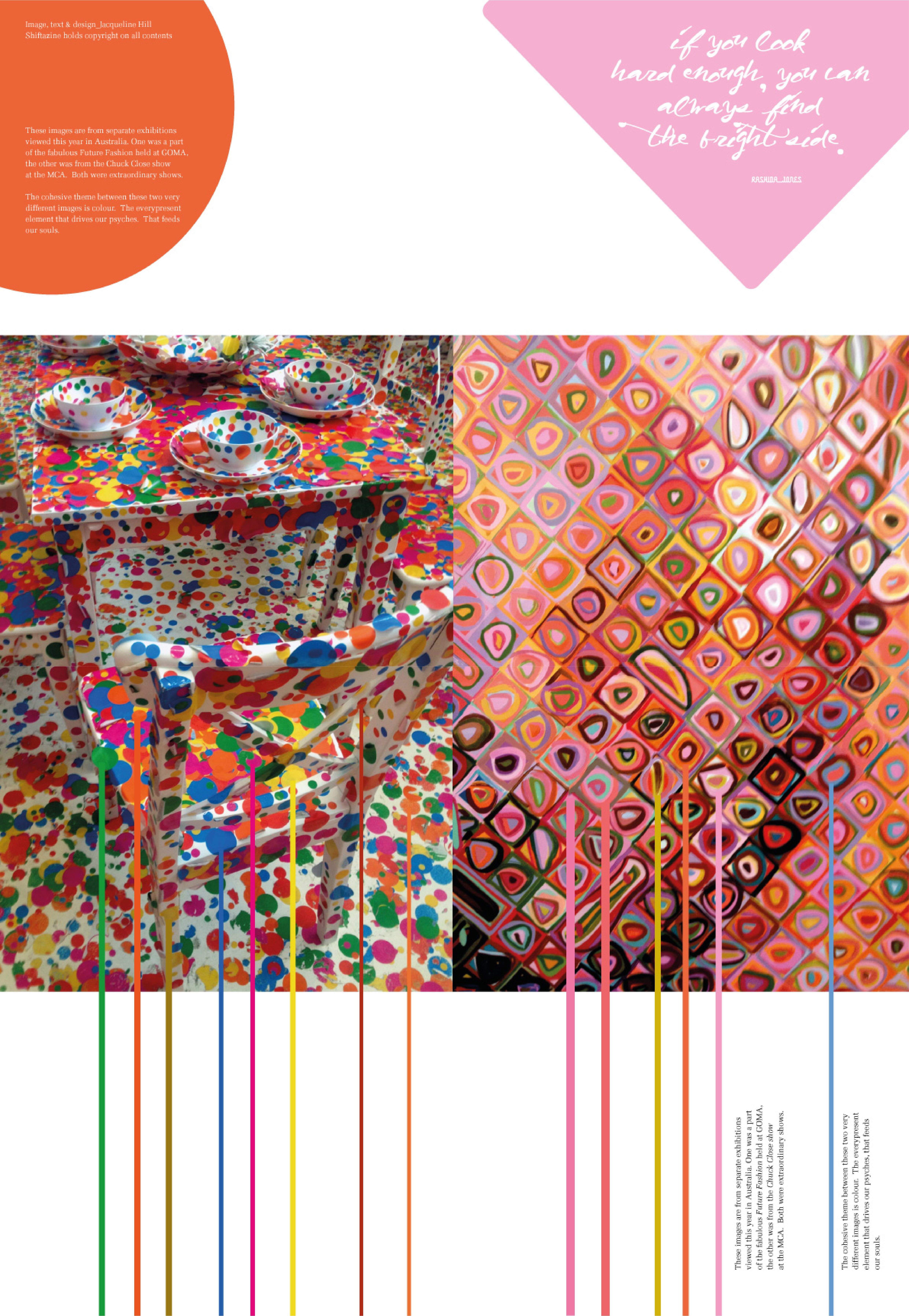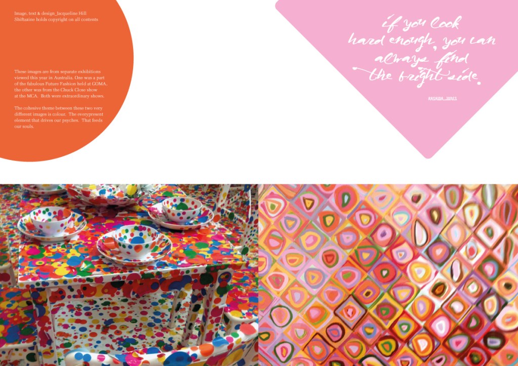A celebratory poster and two double page spreads for Shiftazine, featuring content from exhibitions presented by MCA Sydney and GOMA Brisbane.