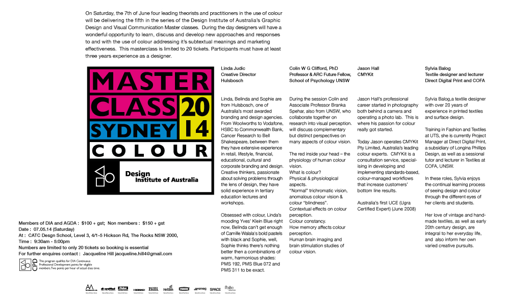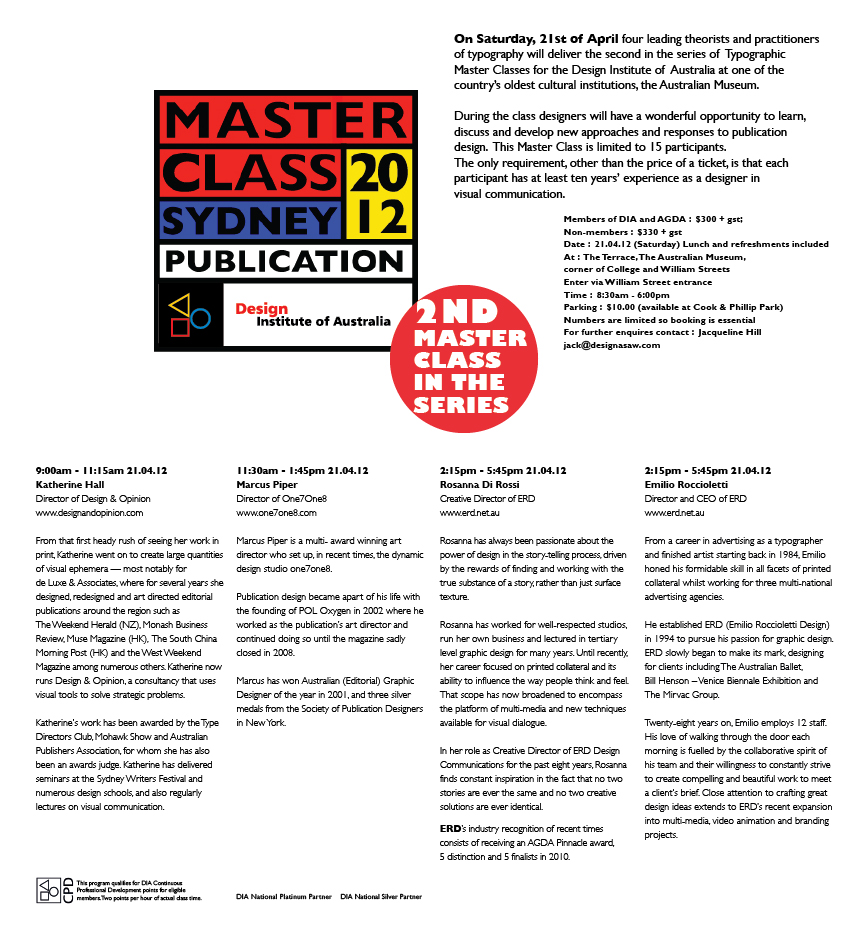 Master Class series for the Graphic Design portfolio of Design Institute of Australia council. Examples of the range of promotional material for print and on line use.