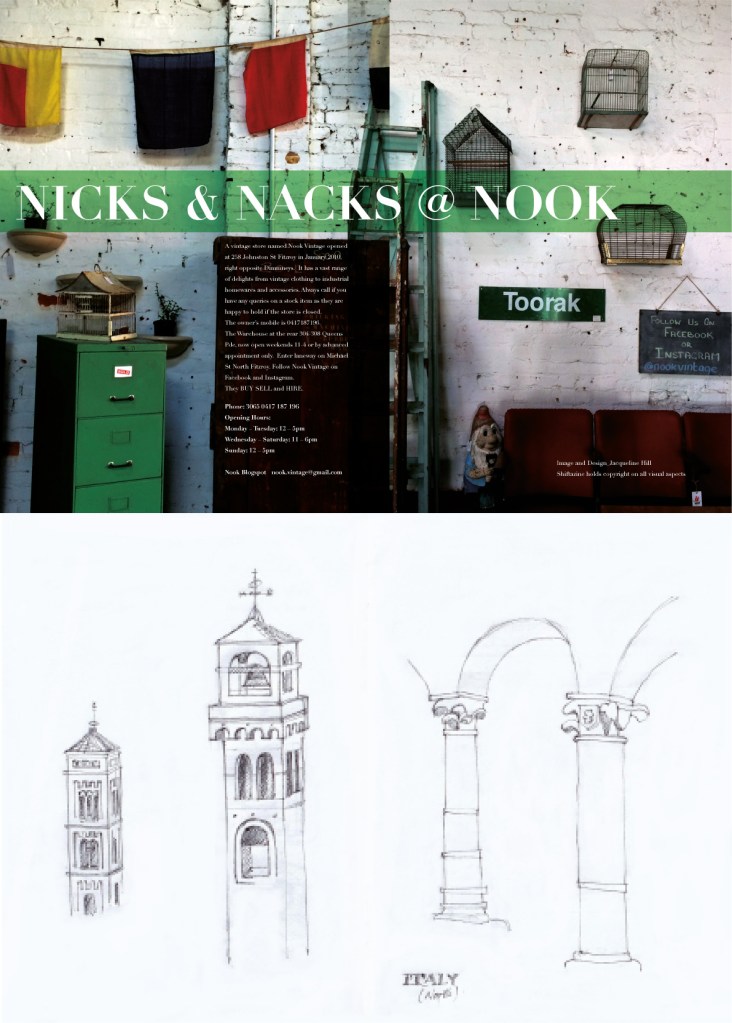 Above: 1 Cover for Shiftazine Issue No.2 ‘Gutter Talks’. Shiftazine multi paged issues were posted on-line on a regular based of about three per year. 2. Press advertisment for a vintage and tat store in Melbourne, Australia , called Nook. 3 .Personal drawings of Renaissance structures in Urbino, Italy. Below: A promotional invitation for the Design Institute of Australia textile discipline event ‘Interwoven’ both print and on line delivery.