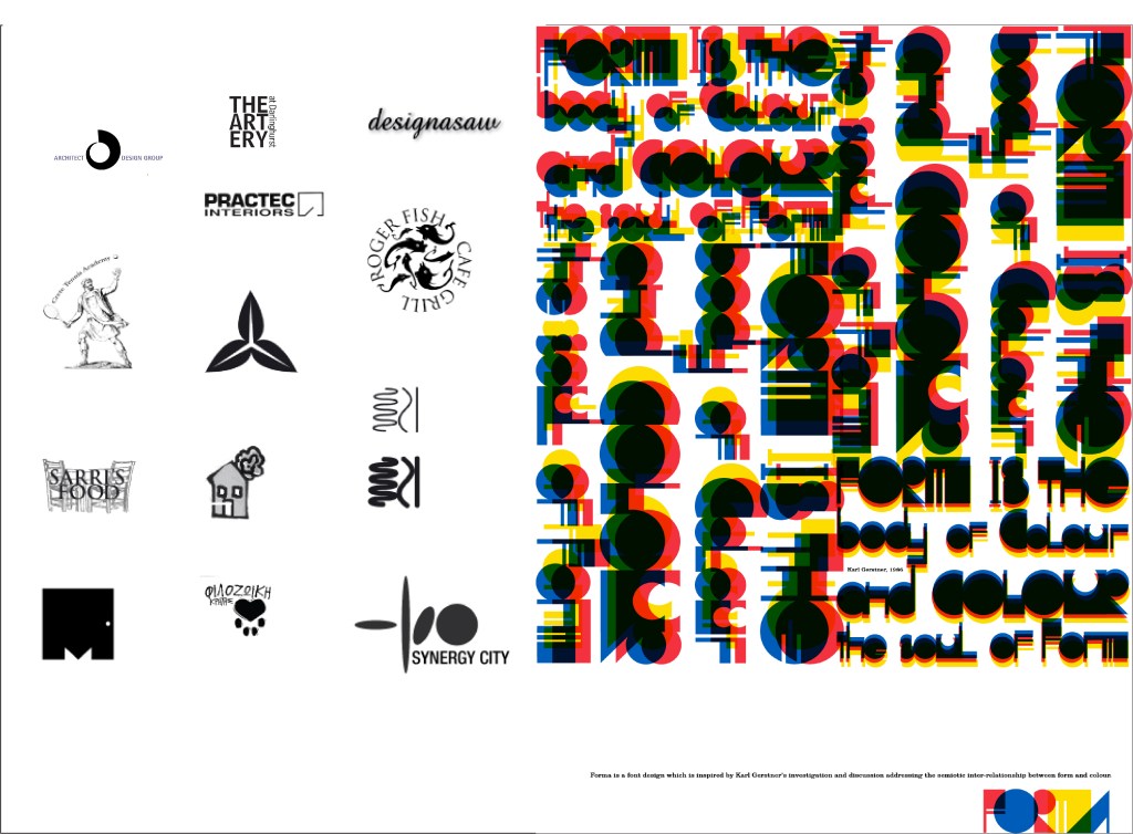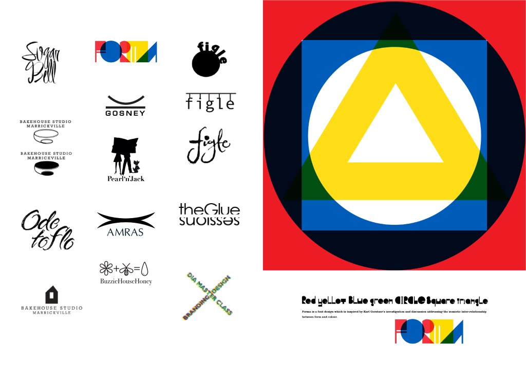 A collection of Visual Identity Marks for a range of clients, new business ventures and NGOs. (from left to right). 1 Sugar Bell. A new venture for a young pastry chef named Bella. 2 FORMA. A new type face based on Karl Gerstner’s theory on form and colour. 3 Figle. A new pickle and condiments company based on traditional Polish recipes. 4 Bakehouse Studios. An established ceramics studio and retailer based in Marrickville (concept development). 5 Gosney. Visual Identity Mark for photographer Paul Gosney . 6 Pearl ‘n’ Jack. Subbrand for Seasonal Concepts specialising in soft furnishings and textiles based on 1940s magazine imagery. 7 Ode to Flo. Title design for a short film made for a film house promotional vehicle. 8 Amras. Visual and corporate identity program for a Medical supplies company. 9 The Glue Sessions. Identity for The Glue Sessions, a design theory workshops and program for practising visual communicators. 10 Final visual identity mark (VIM) for Bakehouse Studio. 11 Visual Identity Mark (VIM) for Buzzie House Honey. Honey retailer based in inner city Sydney. 12. Identity for the Design Institute of Australia in the Graphic Design Master Class series. 2.Promotional poster design for FORMA type face.