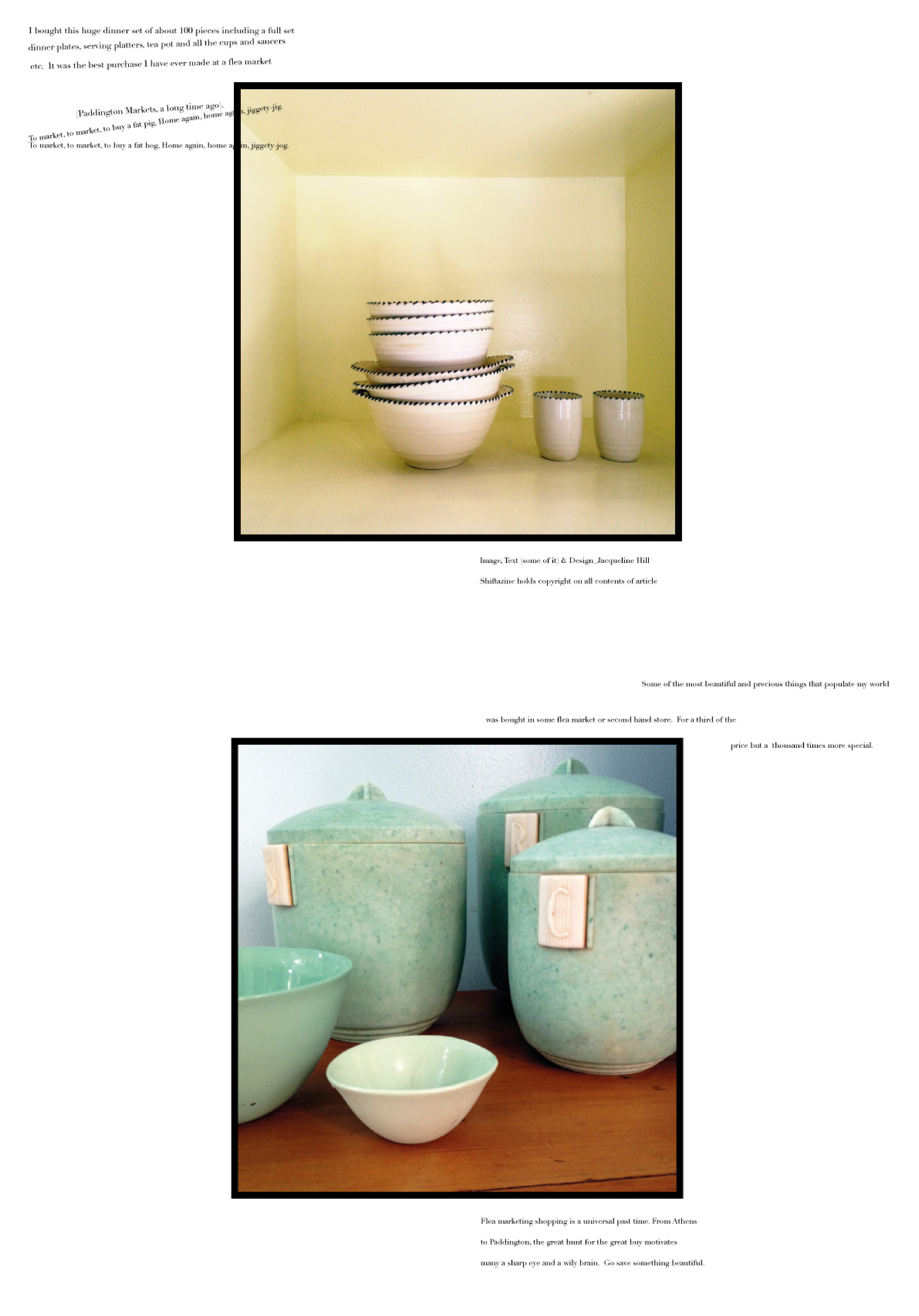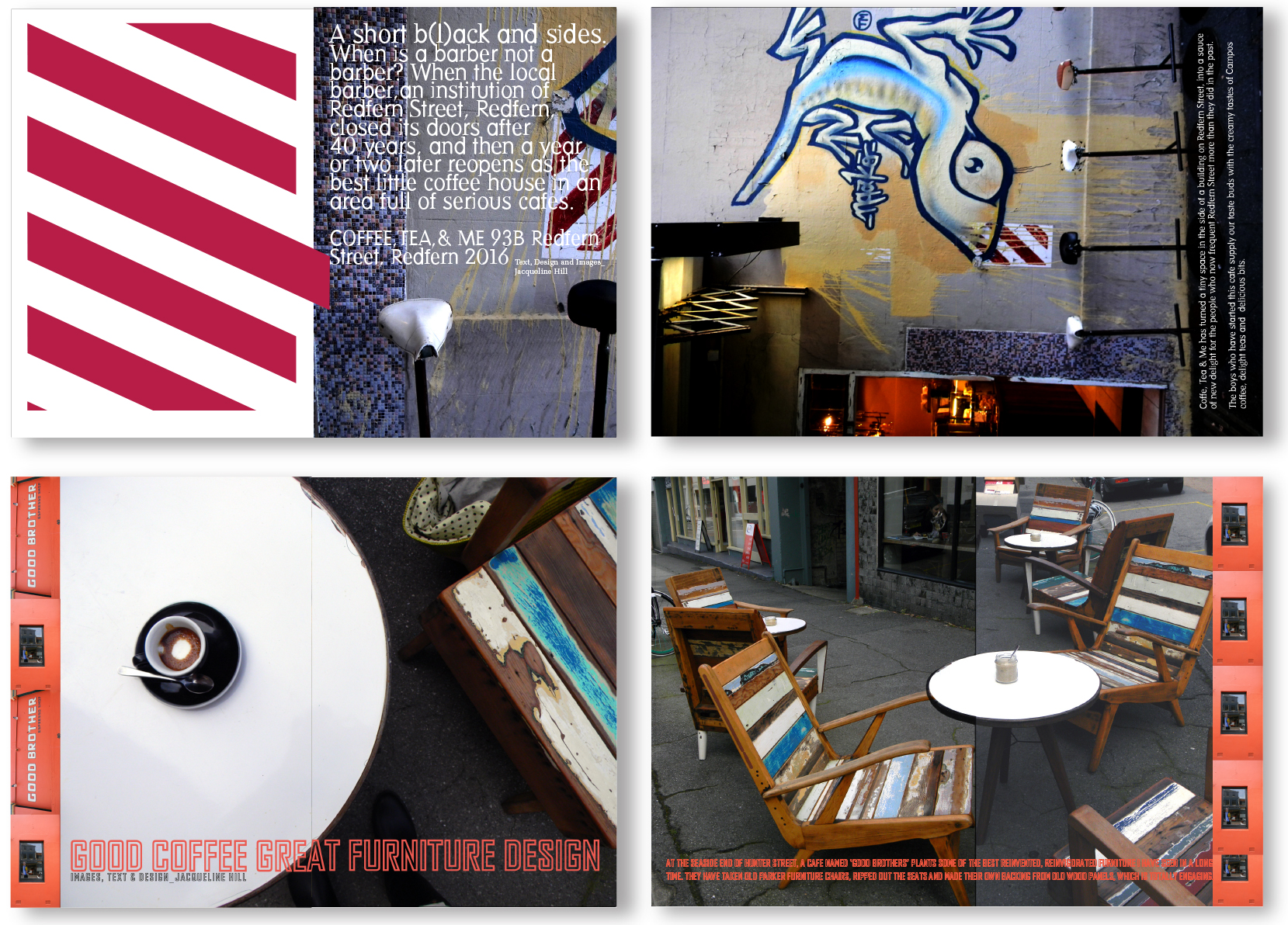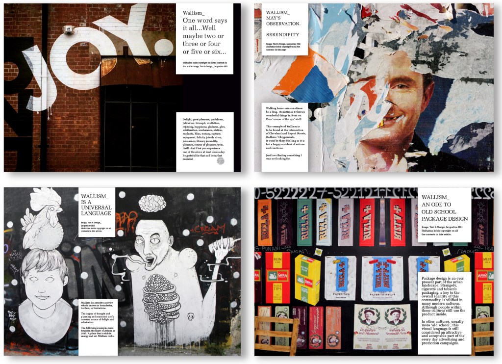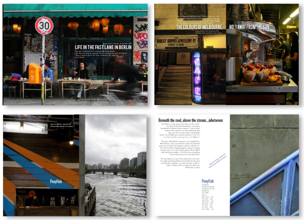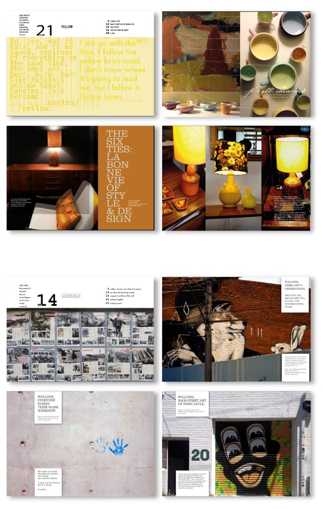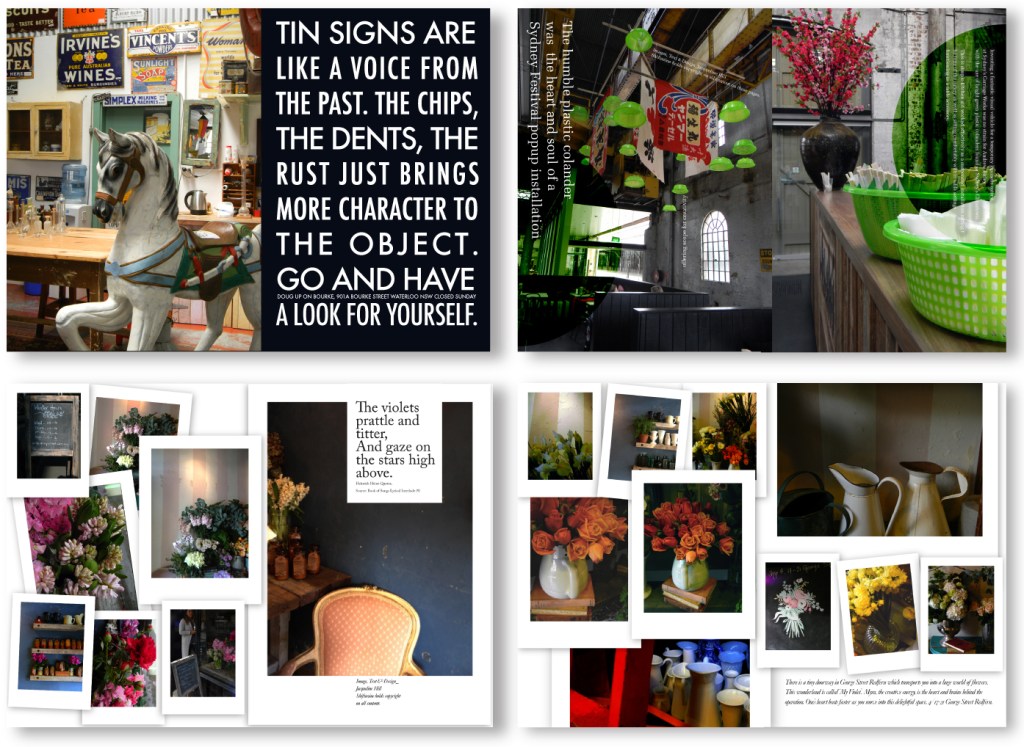 Above: I developed and launched the annual day of joy known as ‘JoyDay’, which occurred on the 25th November, every year. This DPS was one example for its promotion. 2. Freedom Furniture. 3. Opening spread for an article discussing inventive interiors design ideas for interiors design store Edite’. 4. Personal photography of observation of street details of Greek Islands. 5. An Incognition Art piece based on my Scrap Art Project ‘Things I love’ series.