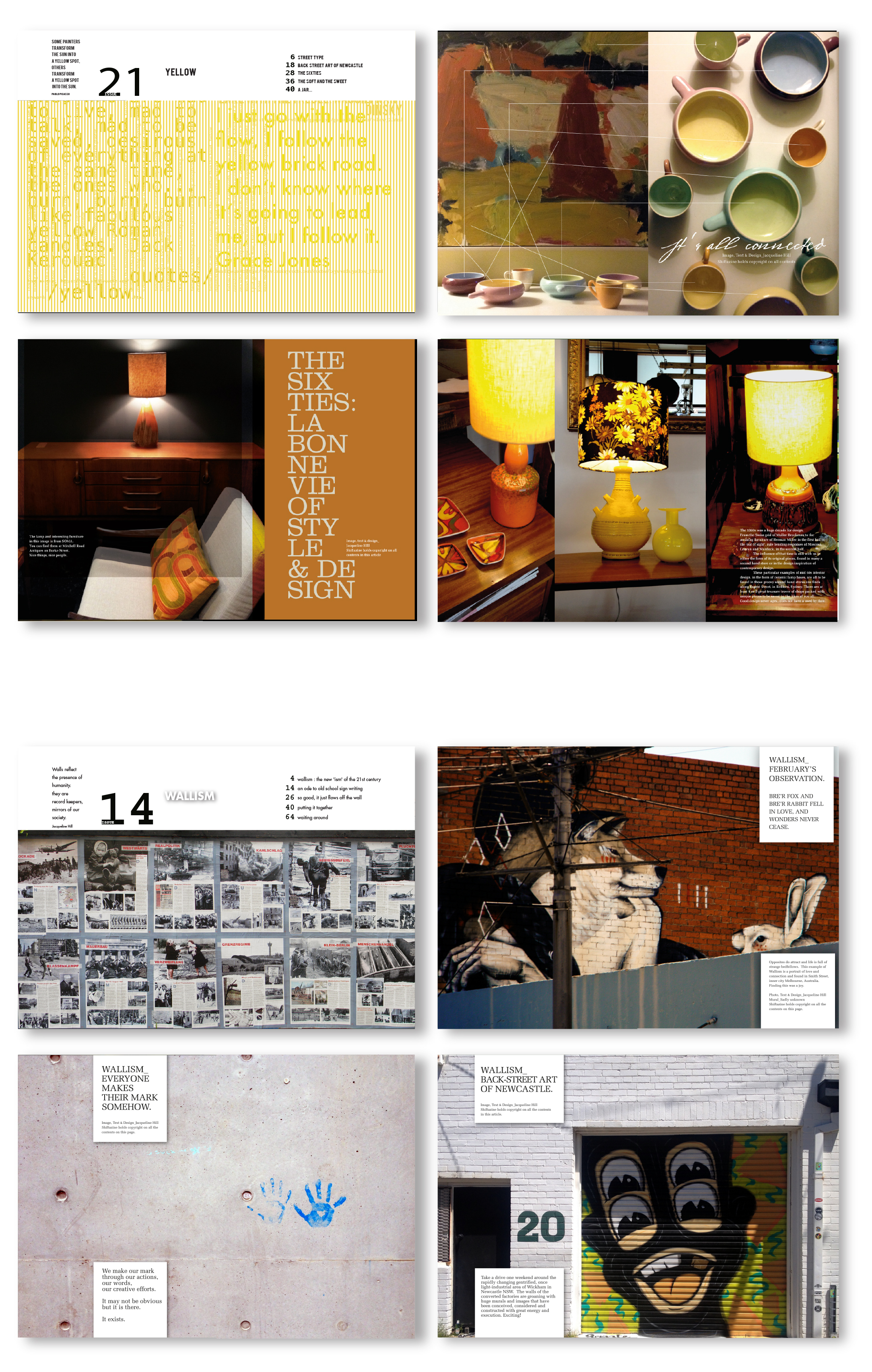 1 & 2. Cover designs for ‘Interesting Places’ Issue No.9 and ‘Wallism’ Issue No.14. 3. Two groupings of articles from two issues of Shiftazine. a ‘The Yellow Issue’ Issue No.21 and “Wallisms’ Issue No.14.