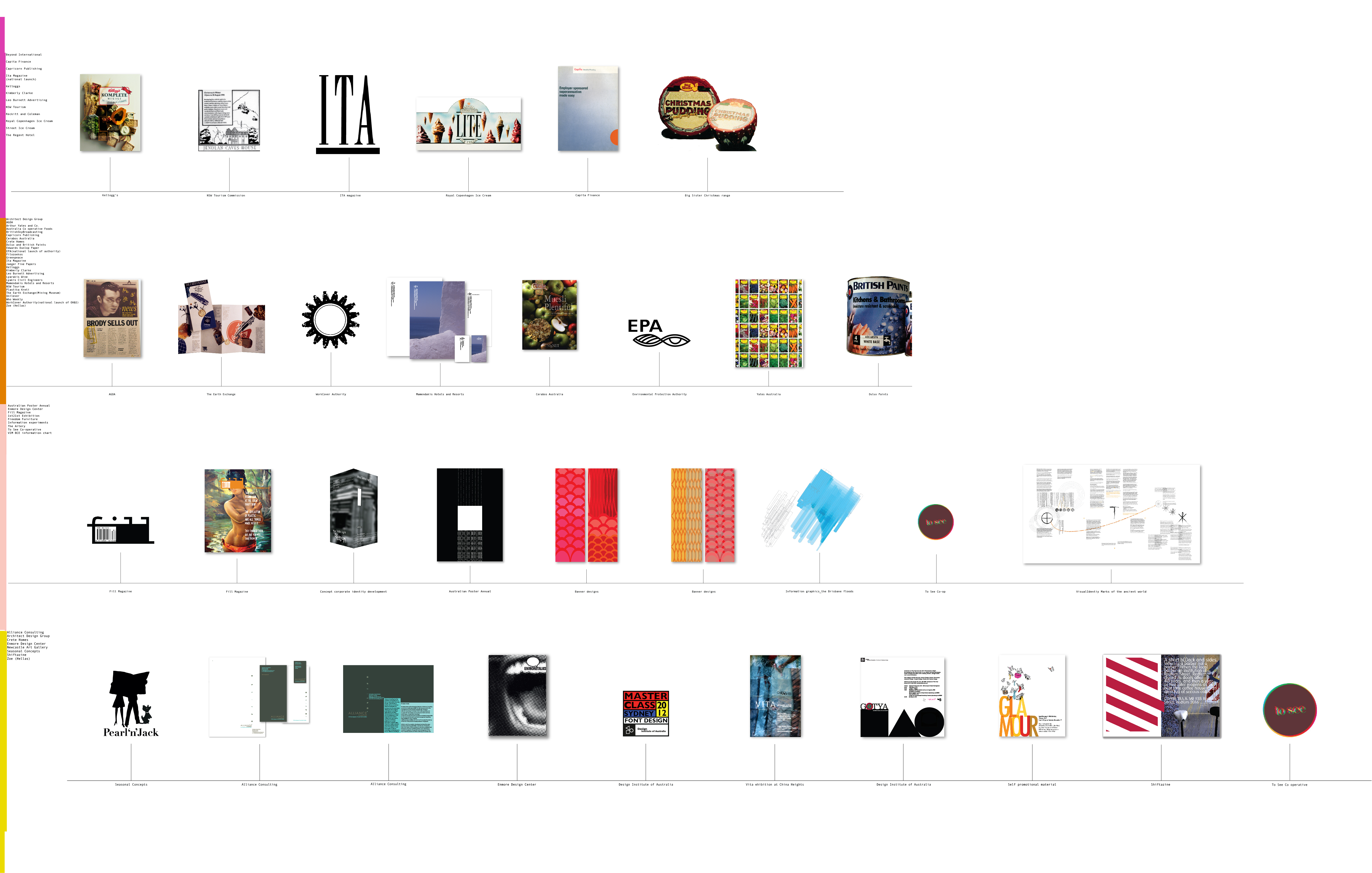 1. A selection of Visual Identity Marks (VIM). Enmore Talks EDC; Sugar Bell Pastries; ‘fill ‘the zine; ITA Buttrose flag ship magazine; BuzzieHouse Honey; EPA Environmental Protection Authority Australia; Workcover Authority; BakeHouse Studio Ceramics; 2. A trip to New York, a visit to the Guggenheim Museum, an observation of colour and shape..
