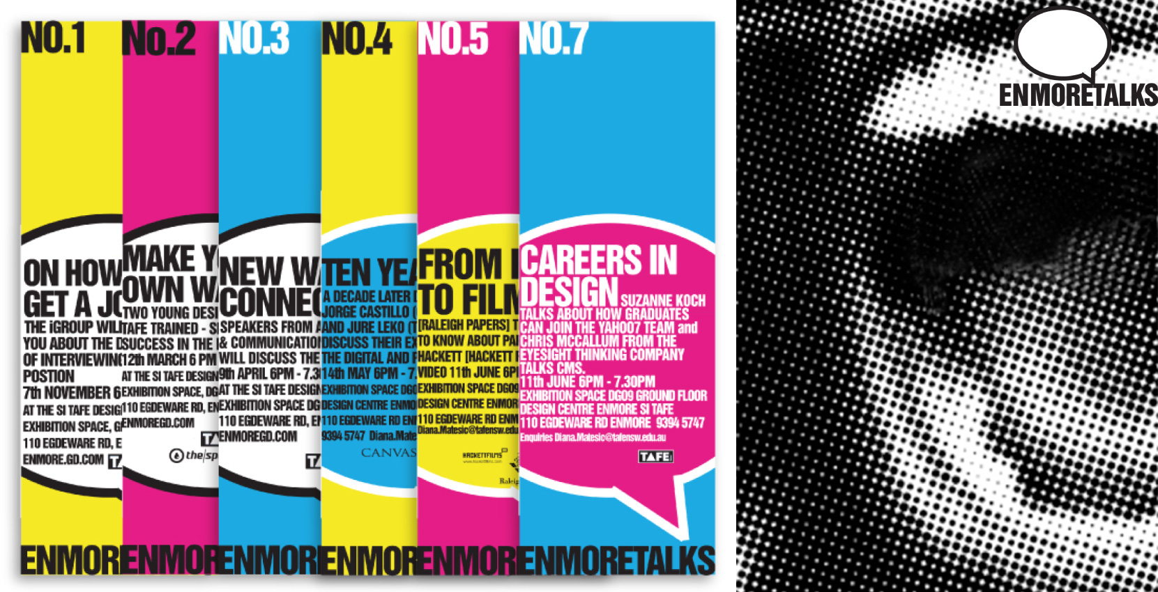 Below: Enmore Talks series was developed to assist the graduating year students of the Enmore Design Center to meet and learn from design industry leaders. The students were in charge of researching, selecting and organising a monthly event that was open to the public and the rest of the student body. The zine was a promotional piece to be circulated out into the design industry to gander interest and engagement.