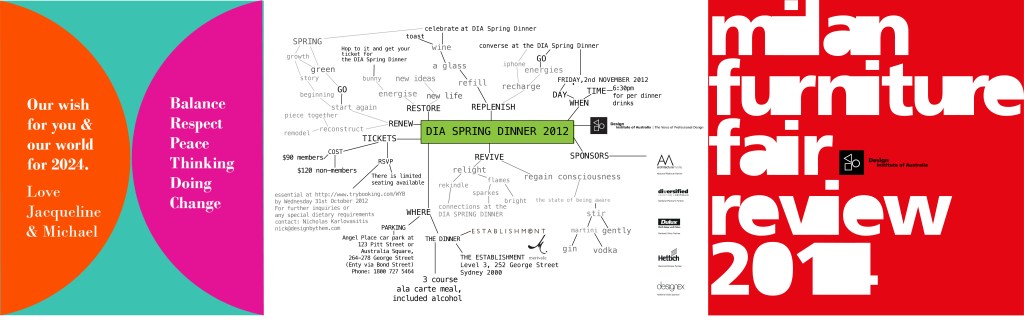 1 My annual Christmas greetings 2. An on line invitation design and collateral for the Design Institute of Australia’s annual Spring Dinner. the visual language was inspired by the process of mind mapping.3. Promotional collateral for print and on line for the Design Institute of Australia