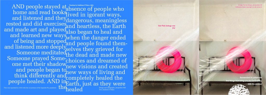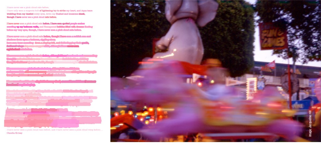 Below: 1. A wonderful poem entitled ‘I have never seen a pink cloud rain’. by Claudia Krizay. It inspired me to develop a typographic response. 2. Personal photography of the Annual Country Show held in the centre of Brisbane known as The Echa. Side show alley has always been a great source of visual fascination for me, and how can one resist a huge pink elephant whirling around and around.