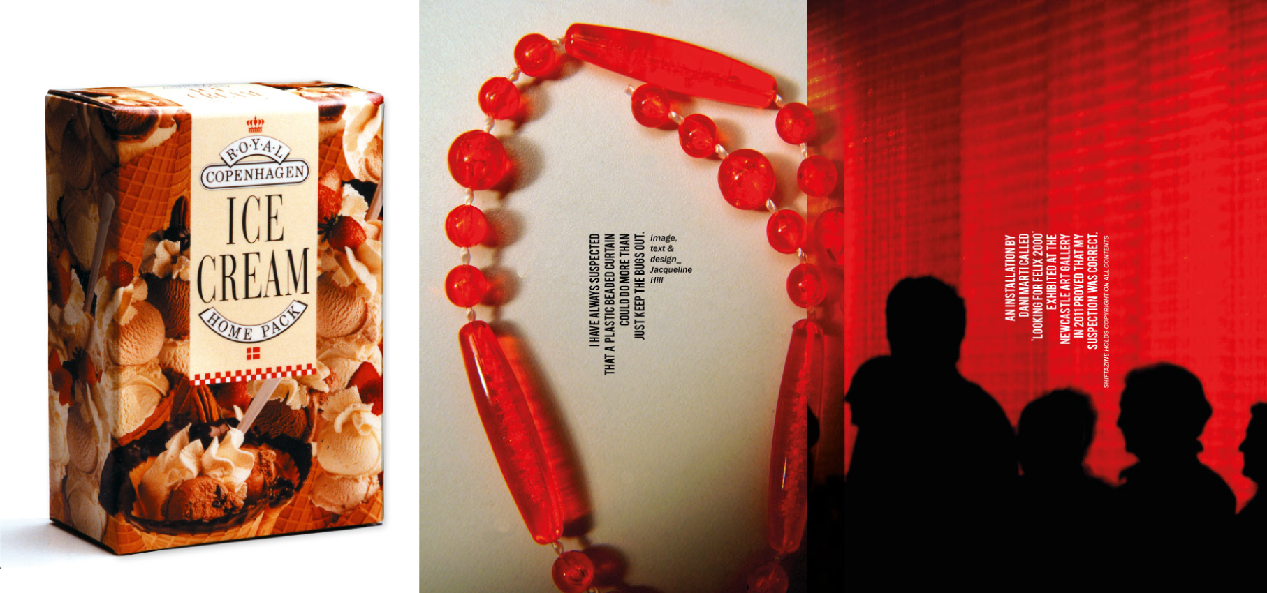 1. Two groupings of articles from two issues of Shiftazine. ‘The Yellow Issue’ Issue No.21 and “Wallisms’ Issue No.14. 2. Package design for Royal Copenhagen Ice Cream. A new idea for RC Ice Cream to extended their market share by creating and offering of a ‘take home’ pack