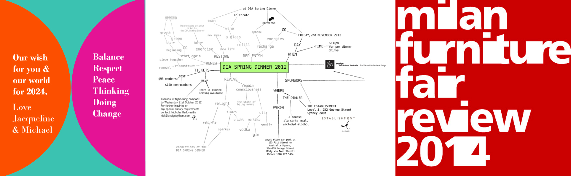 1 My annual Christmas greetings 2. An on line invitation design and collateral for the Design Institute of Australia’s annual Spring Dinner. the visual language was inspired by the process of mind mapping.3. Promotional collateral for print and on line for the Design Institute of Australia