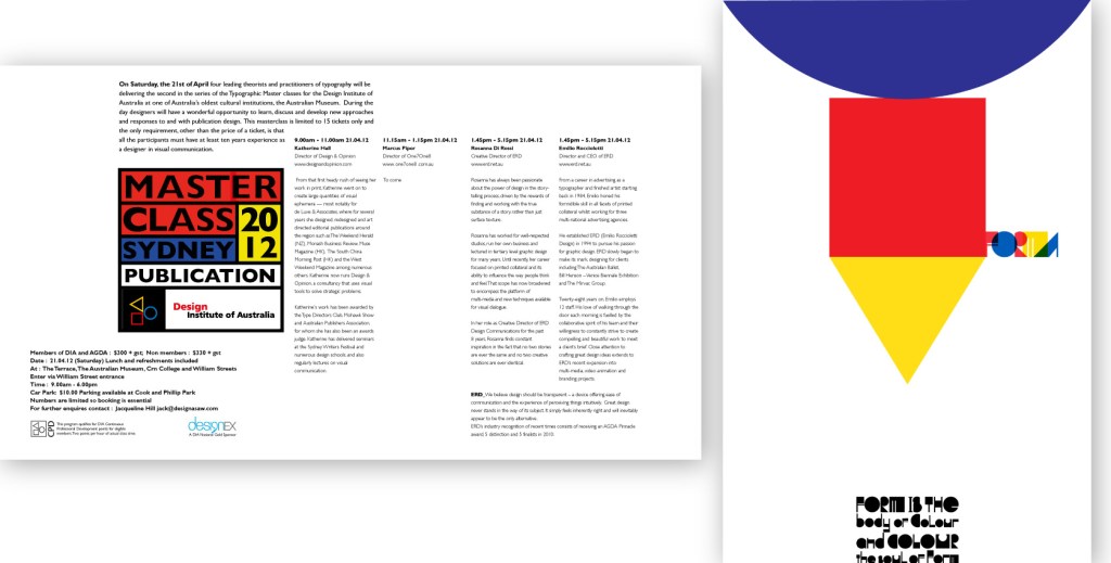 1. Design and delivery of the Master Class series for the Design Institute of Australia. Print and online material. 2. Poster design to promote the new type face FORMA