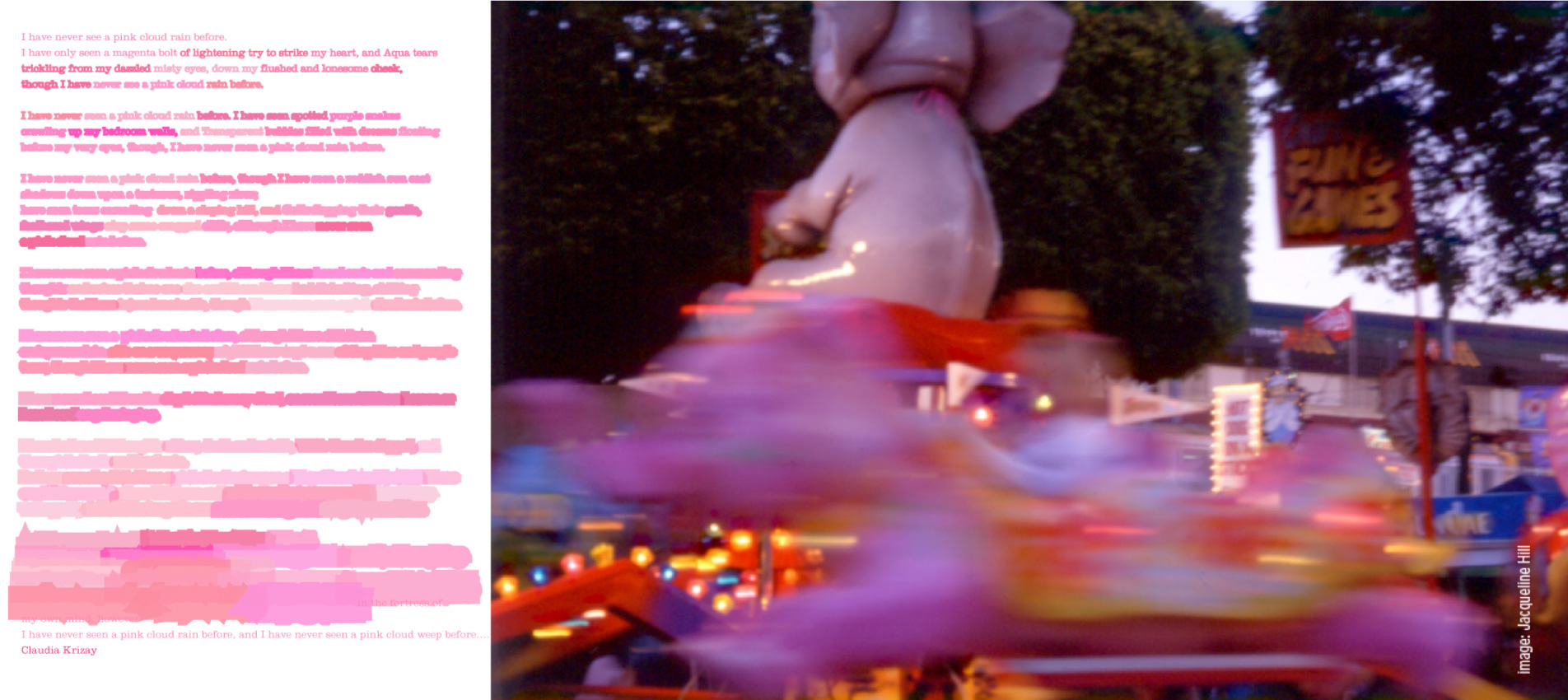 Below: 1. A wonderful poem entitled ‘I have never seen a pink cloud rain’. by Claudia Krizay. It inspired me to develop a typographic response. 2. Personal photography of the Annual Country Show held in the centre of Brisbane known as The Echa. Side show alley has always been a great source of visual fascination for me, and how can one resist a huge pink elephant whirling around and around.