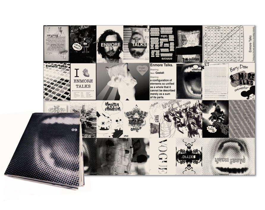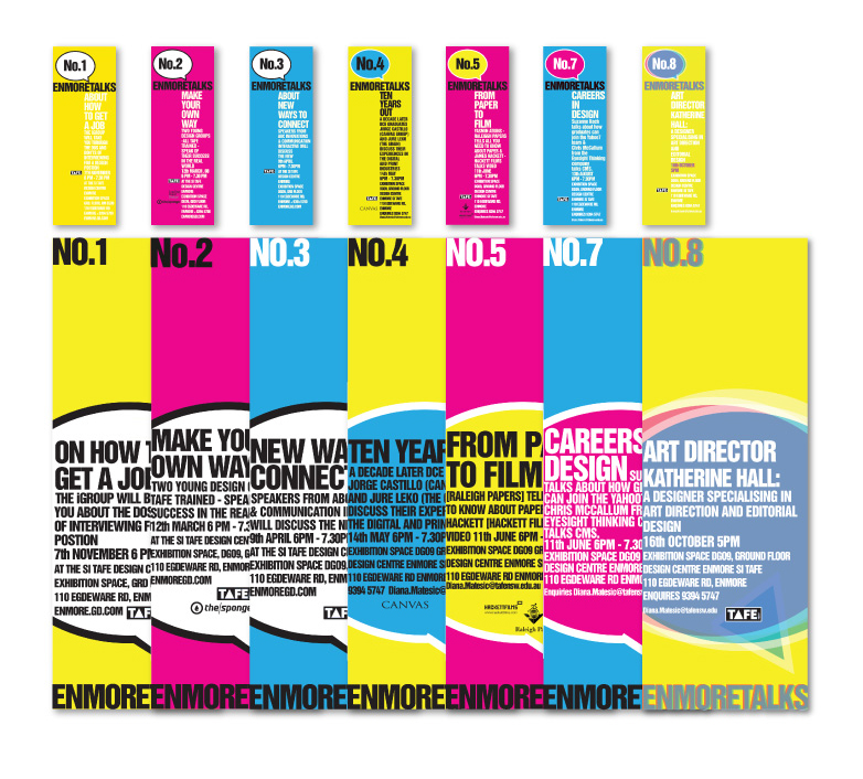 Below: Enmore Talks series was developed to assist the graduating year students of the Enmore Design Center to meet and learn from design industry leaders. The students were in charge of researching, selecting and organising a monthly event that was open to the public and the rest of the student body. The zine was a promotional piece to be circulated out into the design industry to gander interest and engagement.